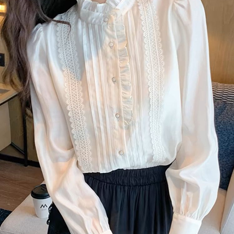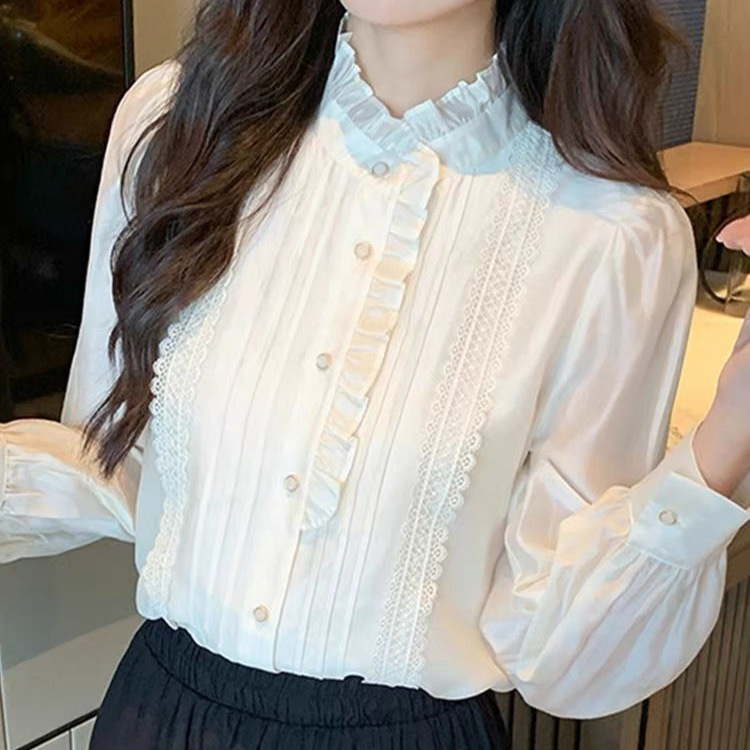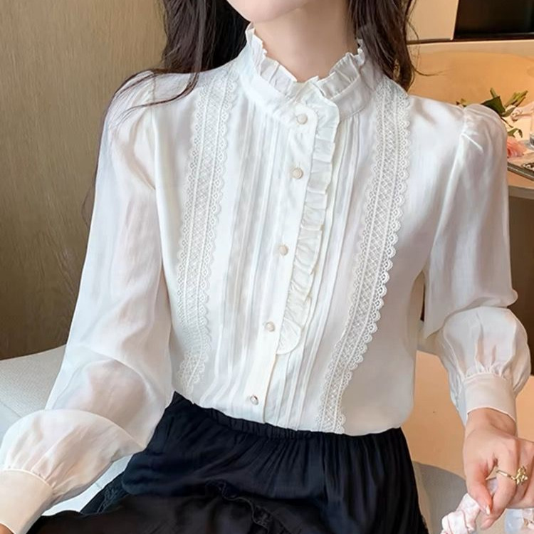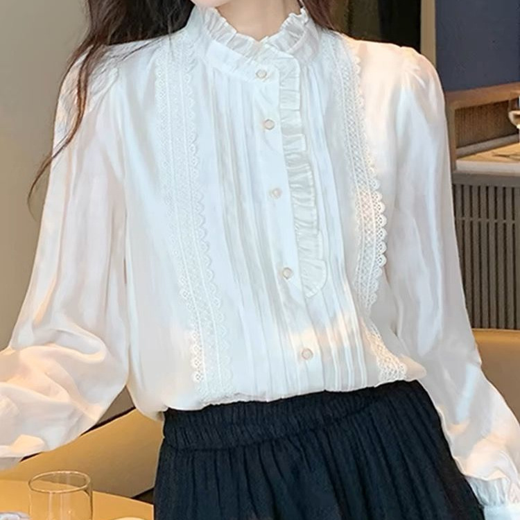 Womens Sophisticated Ruffle-Trim Long-Sleeve Stand-Collar Shirt
